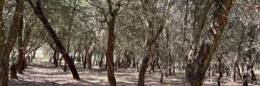 Cultivo con fertirrigación de alcornoques para la producción de corcho.