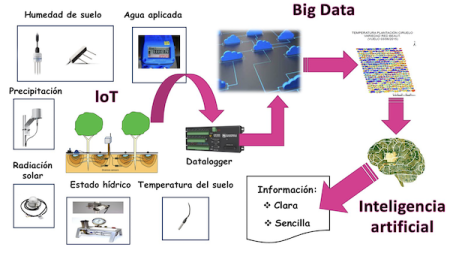 - Objetivo: Desarrollo de un sistema digital de captación de datos de sensores en campo y adaptación a sistemas de toma de decisiones en parcelas. Se desarrollará una red de captación de datos de diferente origen, tanto de sensores de medida continua, como medidas discretas, depurado, procesado y visualización, escalables e integración en modelos escalables de tomas de decisiones agronómicas: programaciones de riego, planes de fertilización, ciclo de vida, etc.